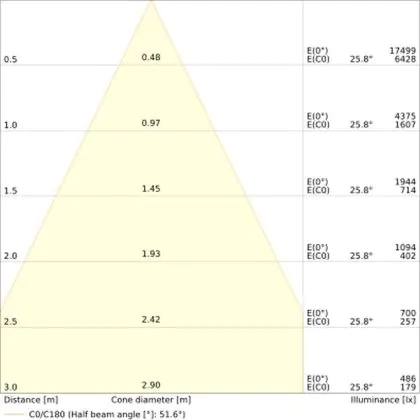 Der Abstrahlwinkel bezeichnet den Winkel, in dem das Licht aus der Lichtquelle ausgestrahlt wird. Er wird in Grad (D) angegeben. Je geringer die Gradzahl des Abstrahlwinkels ist, desto kleiner ist auch der Durchmesser des Lichtkegels, den die Lichtquelle produziert.