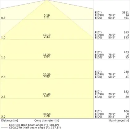 Le code couleur se compose de l'indice de rendu des couleurs (IRC) et de la température de couleur (Kelvin). Le premier chiffre indique le rendu des couleurs (1 = très mauvais rendu des couleurs, 9 = meilleure authenticité des couleurs). Le deuxième et troisième chiffre indiquent la température de la couleur. Exemple : Le code couleur "830" indique que la lampe a un bon rendu des couleurs (8) et une couleur de lumière blanche chaude (30 = 3000K). |